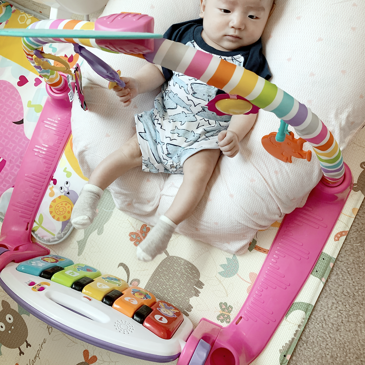 국민 육아템이라고 불리는 놀잇감들이 있다. 아기 체육관이 대표적. 아기자기한 캐릭터가 그려져 있는 패드에 아기가 등을 대고 누우면 아기의 눈이 맞닿는 곳에 동물 캐릭터 인형들이 올망졸망 걸려있다. 동시에 아기의 발은 미니 피아노 건반에 가 닿는다. 발로 두드리면 음악이 흘러나오는 일명 '뮤지컬 토이'. 아기의 시야 확장을 도와줄 수 있게끔 시선을 끄는 매력덩어리 인형이 걸려있으니 인지발달에도 도움될 테고, 건반을 신나게 두드릴 수 있으니 신체능력 발달에도 두루두루 좋을 게 분명하다. 누가 이렇게 똑똑한 아이템을 만들었지? 이 아이템만큼은 싫어하는 아기들의 거의 없을 것만 같다.