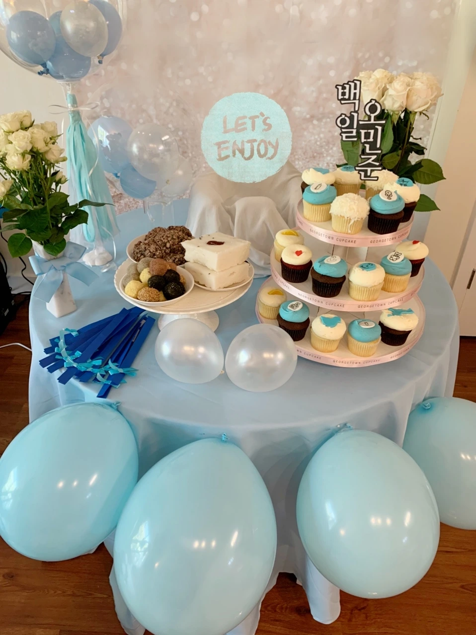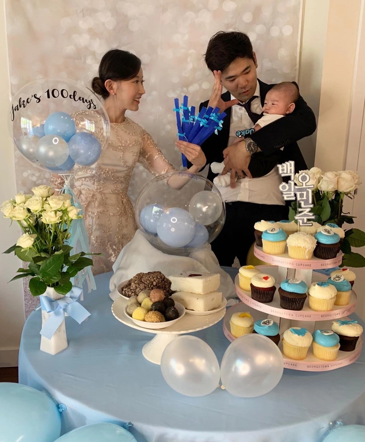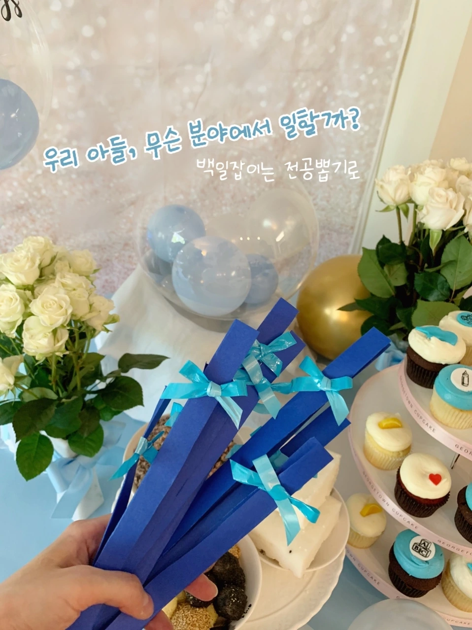 떡집에서 당일 신선하게 갓 쪄낸 따끈따끈한 백설기 대신 한인마트에서 사 온 몇 조각의 냉동 모둠떡들이 전부였지만 아기 백일을 진심 다해 축하하는 마음은 그 어느 육아의 순간보다도 쫄깃하고 촉촉했다. 전통 백일상을 대여하는 것만큼 고풍스럽고 멋들어진 매력은 없었지만 한 달 전부터 누누이 강조한 '베이비 블루' 색깔로 아기자기함을 더하는 맛, 오랜만에 교실 환경미화 심사를 앞두고 셀프 꾸밈에 혈안이 되었던 추억들마저 솔솔히 떠올랐다. 덕분에 여고생 시절로 돌아간 듯한 오묘한 착각까지 선물 받았으니 일석이조가 따로 없네.