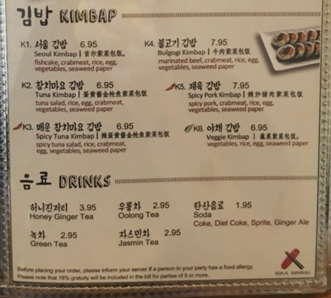 당연히 한국형 분식집도 있지만 타국의 한식당이 가성비 좋을 리 없다. 참치 김밥 한 줄 6.95달러, 불고기 김밥 7.95달러. 오늘의 환율 (1달러=1,192.50원)을 적용했을 때 전자는 8,287원, 후자는 9,480원 되시겠다. 세금과 팁까지 포함하면 김밥 한 줄에 만 원이 족히 넘는다. 비싸지만 맛있는 게 함정이다. 그나마 임신했을 때는 아까운 줄 모르고 마음껏 사 먹었다. 내가 먹고 싶은 게 아니라 아기가 먹고 싶은 거였으니까. 18개월 아기를 키우는 요즘은 한 푼이라도 아끼고픈 마음에 감히 지르지 못한다. 김밥도 마음먹고 ‘질러야’하는 나라에 살고 있다.