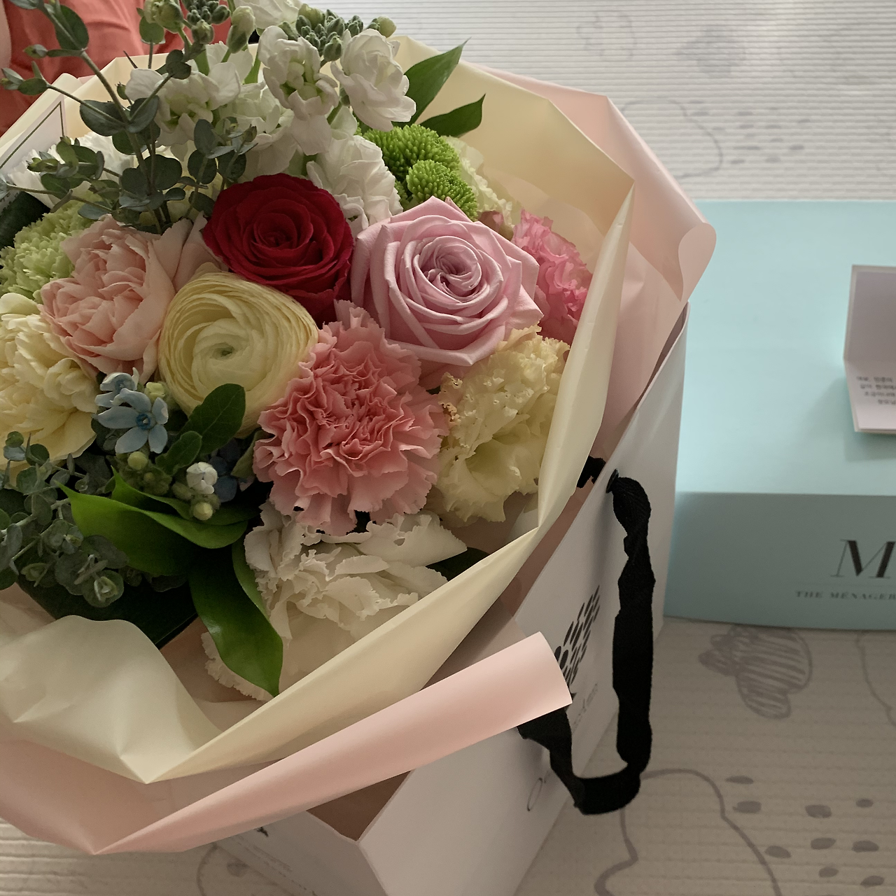 미국 여행하느라 수고 많았지. 한국 가자마자 시차도 안 맞을 텐데 다시 방송 복귀하느라 고생이다. 이 꽃 보고 조금만 더 힘내 줘. ㅡ너의 OO