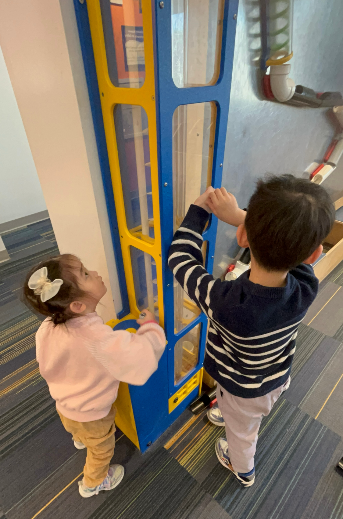 아이가 이 공간에서 맨 처음 매료됐던 건 손으로 핸들을 무한 돌려 공을 뱅글뱅글 상승시킨 뒤 아래로 다시 또르르 떨어지게 만드는 기구. 가뜩이나 동그란 물체 뱅글뱅글 돌리는 걸 무한 반복했던 게 아기 시절의 감각 추구였는데, 여기선 신경다양성 아이가 좋아할 법한 놀이를 구현하되, 조금 더 과학적인 상승 - 하강 놀이를 덧대었다. 또 다른 친구들과 그 감각을 함께 느낄 수 있도록 공동 놀이공간을 충분히 마련해 놨다. 의미 없는 감각추구만 계속 반복하라고 판 깔아준 게 아니라, 아이가 좋아하는 감각을 존중하되, 거기에 또래와의 상호작용할 수 있는 구성도 넣어두고 학습적인 요소까지 추가해 준 거다. 별것 아닌 것 같지만 아이가 신나서 방방 뜨다가도 뮤지엄이 의도한 대로 마치 과학자처럼 때론 집중하고 신중해지는 걸 보니 '오티즘 프렌들리' 딱지가 괜히 붙은 건 아니구나! 만족스러웠다.