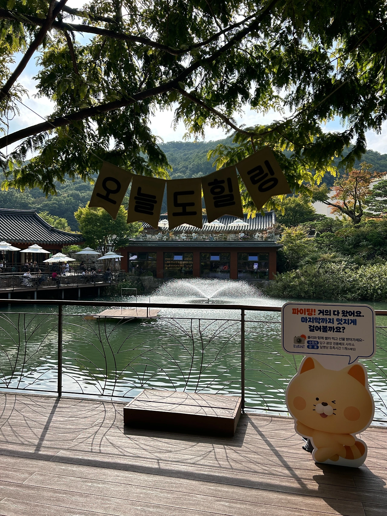 마무리 지어야 할 업무가 있어서 아이들을 어린이집에 등원시키자마자 다이어리와 랩탑을 챙겼다. 자, 그래서 어디로 가지? 작년 하반기부터 회원권을 끊어둔 스터디 카페도 있고 이따 애들 하원시키기 편한 동선에 있는 동네 카페도 떠올랐다. 다만, 햇살이 너무 좋은 날이었다. 게다가 금요일! 아무리 몰입 끌어올리는 우아한 조명이 있대도 자연광을 꼭 받아야 하는 초가을 아침을 놓치고 싶지 않았다. 몇 번씩 들렀던 단골 카페보다는 한 번도 안 가봐서 낯설어도 보는 순간 '자연' 매력 뿜뿜 해서 첫눈에 반해버릴 만한 공간에 가고 싶었다. 하아, 이럴 땐 결국 핸드폰에 집착하고 싶지 않아도 리버뷰 카페, 숲뷰 카페 알고리즘에서 헤엄치는 수밖에. 그렇게 몇 차례의 디지털 파도를 타고 찾은 한 카페. 남한산성 근처의 카페는 물레방아도 돌고, 정원 조경도 그럴듯했다.