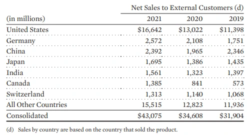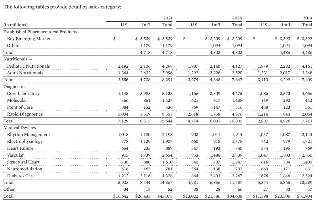 매출 43B$, 영업이익 8B$, 영업이익률 20% 수준. 부문별 매출은 제약제품 11%, 영양(분유등) 19%, 진단 36%, 의료기기 33% 비중을 보였다. 의료기기 중에서는 당뇨병 분야가 전체 매출의 10%를 차지하면서 가장 큰 비중을 보였다. 영양 부문의 경우 절반 가량이 해외 매출이었다.