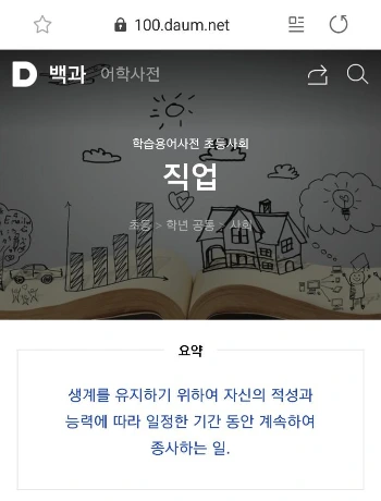 초등학생용 백과사전을 보면 직업(職業,Occupation)이란 "살아가는데 필요한 돈을 벌기 위해 자신의 적성과 능력을 고려하여 어떤 일에 일정 기간 이상 종사하는 것"이라고 정의하고 있다.