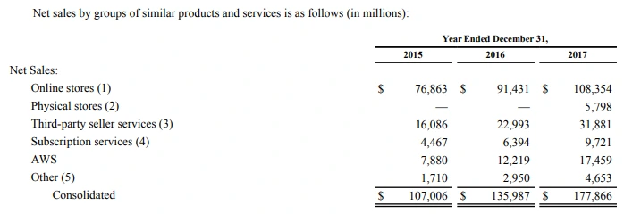 2017년 오프라인 스토어 매출이 처음으로 분류되어 공시되기 시작했으므로 당시 연간보고서를 한번 봐보자. 2017년 온라인 스토어가 61%를 차지했고 오프라인 스토어가 3%, 위탁 판매 서비스가 18%, 구독 서비스가 5%, 클라우드(AWS)가 10%를 차지했다.