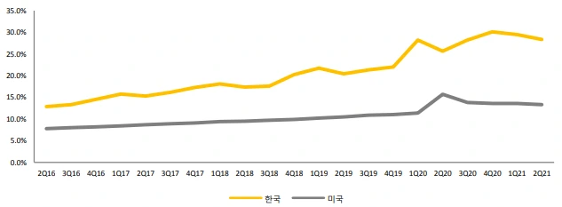 미국의 경우도 미국 상무부에서 발표한 분기별 자료를 보면 2020년 2분기 15.7% 비중으로 정점을 기록한 이후 2021년 2분기까지 하향 안정화 추세를 보였다.(최근 숫자는 2022년 1분기 14.3%의 비중을 보였다.)