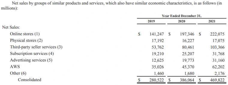 아마존의 전체 매출 470B$ 중 온라인 스토어가 47%를 차지하고 있고 오프라인 스토어가 4%, 위탁 판매 서비스가 22%, 구독 서비스가 7%, 광고 서비스가 7%, 클라우드(AWS)가 13%를 차지하고 있다.