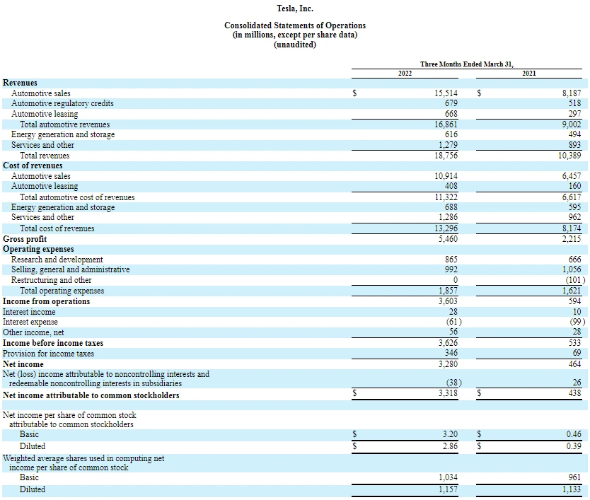 자동차 판매 매출(판매만 고려했다)은 15.51B$로 전년 동기 대비 89.5%늘었다. 눈에 띄는게 이익률이다. 매출에서 매출원가를 제해서 구해본 이익률을 보면 2021년 1분기 21.1% 마진이 2022년 1분기 29.7%로 늘어났다. 가치투자자가 가슴 설레하는 단어 규모의 경제가 발생하고 있는 것이다. 물론 워낙 테슬라가 가격 인상을 적극적으로 진행한 부분도 있지만 기사를 조금 찾아보니 전기차 양산에 기가프레스(차체를 통째로 찍어내는 방식) 공법이 본격적으로 적용되고 자동화율이 올라가면서 제조원가를 줄였다는 내용이 있었다.