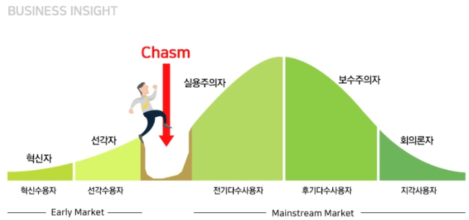 신기술 관련 경영학 용어 중에 캐즘이라는게 있다. 캐즘(Chasm)이란 초기시장과 주류시장 사이에 나타나는 수요의 하락이나 정체 현상을 의미한다.