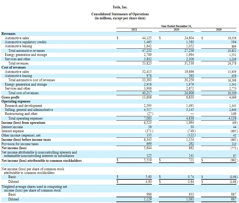 일단 숫자 단위가 바뀌었다. 10년전 in thousands 였던 단위가 지금은 in millions로 바뀌었다. 자동차 판매 매출은 대략 10년 사이에 300배 증가한 꼴이다. 그리고 10년전 영업적자 규모는 2천억원 단위 적자였다.