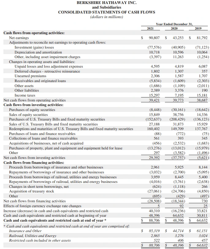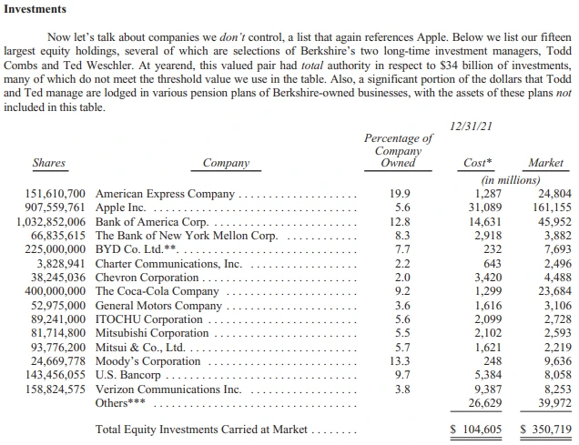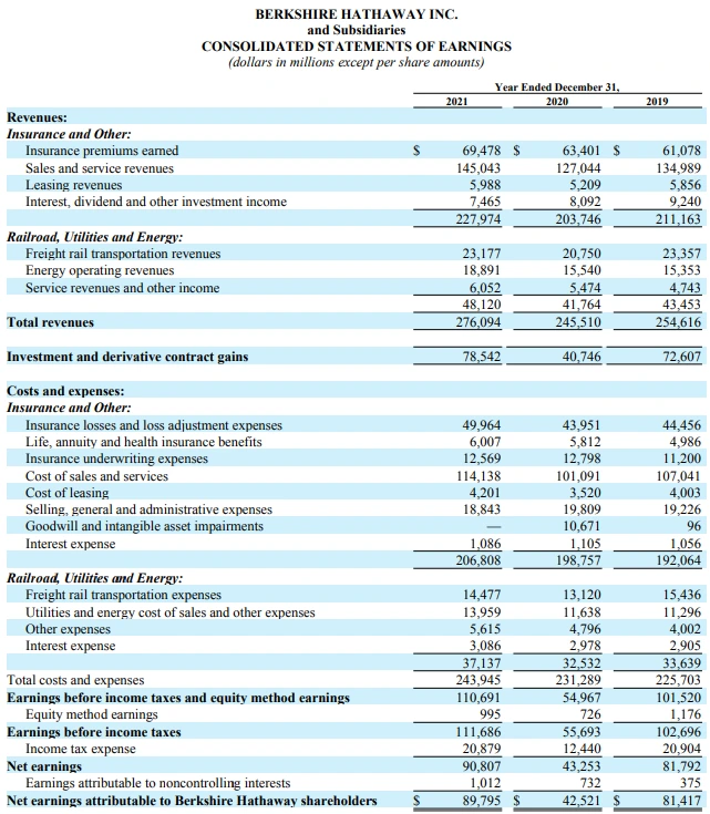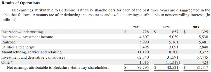 버크셔 해서웨이 연간보고서89.8B$의 순이익에서 투자이익은 62.3B$를 기록했다. 투자이익이 69%, 제조서비스소매가 12%, 철도가 7%, 보험쪽이 6%, 에너지가 4%를 차지했다. 지난 몇년간 상황을 봐도 투자이익이 70%가량 비중을 보였다.