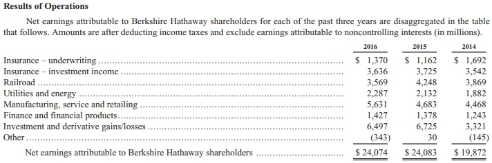 버크셔 해서웨이 연간보고서(2016년)2016년 부문별 이익을 보면, 24.1B$ 순이익에서 투자이익이 27%, 제조서비스소매가 23%, 보험쪽이 21%, 철도가 15%, 에너지가 9%, 재무상품(주택금융등)이 6%를 차지했다. 참고로 2015년 투자이익 비중 28%, 2014년 17%였다. 2011년에는 투자이익이 적자를 기록하기도 했으나 보험, 철도 등은 꾸준했다.