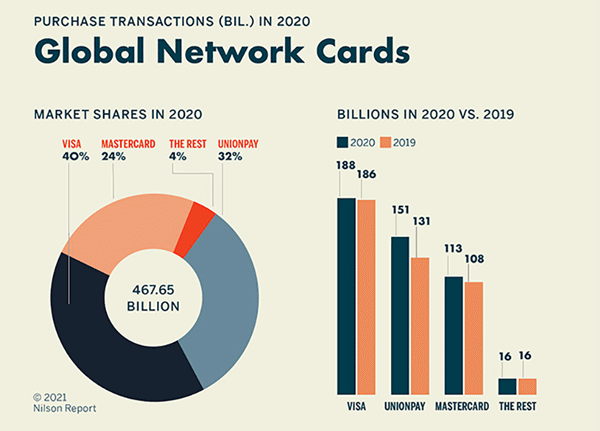 글로벌 구매 거래 건수를 기준으로 봤을 때 비자가 40%, 유니언페이가 32%, 마스터카드가 24%를 차지하고 있다. 미국 신용카드 점유율로는 비자가 50%, 마스터카드가 20% 정도 차지하고 있다고 한다.(위의 그림에서 단위에 달러가 없길래 좀더 찾아보니 건수를 기준으로 만든 자료가 맞는거 같다. 맥킨지 리포트에서는 글로벌 지불 총액을 대략 2T$ 그러니까 2~3경원 정도로 보고 있다. 그리고 거래 금액을 기준으로 보면 유니언페이가 1위라고 한다.)