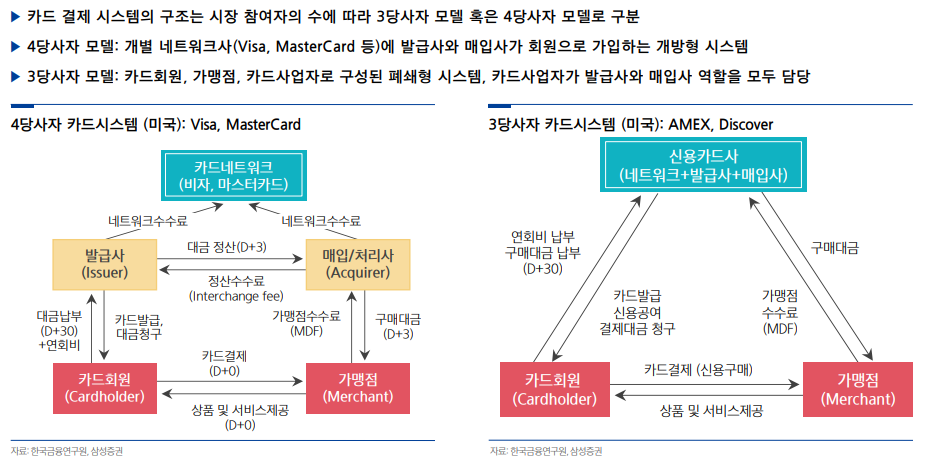 위의 3당사자 시스템이 한국 카드사 사업구조라고 하는데, 카드 가맹점으로 부터 받는 카드 수수료, 카드 회원들이 납부하는 연회비 등이 주요 수입원이라고 한다. 미국의 American Express, Discover 같은 기업이 이런 사업구조를 갖고있다고 한다. 여기서는 카드사업자가 발급사와 매입사 역할 모두를 담당한다고 한다. 폐쇄형 시스템 closed-loop라고 불린다고 한다.