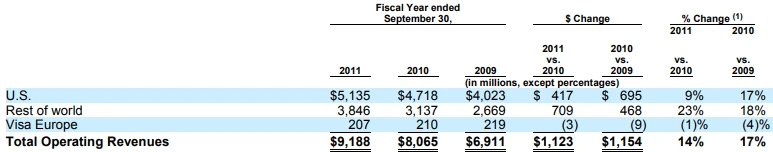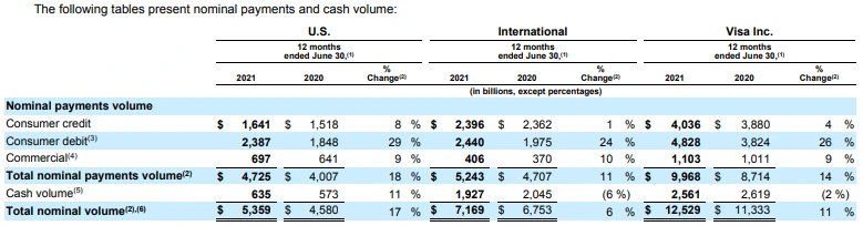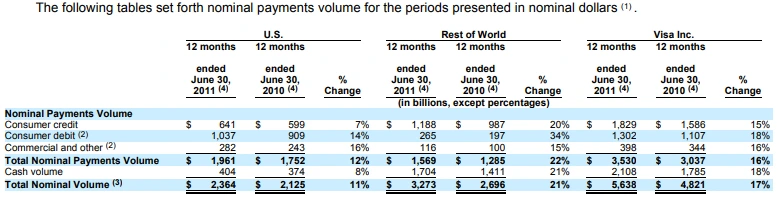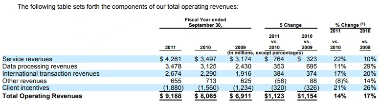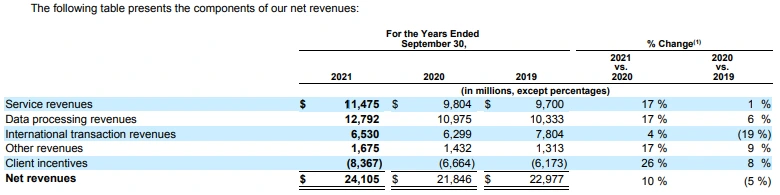 전체 순수익이 24.1B$ 였다. 고객인센티브 차감 전 수익을 기준으로 보면 데이터 처리 수익이 39%, 서비스 수익이 35%, 국제 거래 수수료가 20%, 기타가 5%를 차지했다.