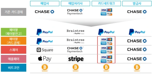 현재의 결제 시스템 상에서는 비자나 마스터카드 같은 네트워크사가 반드시 필요하다고 한다. 반면 위의 그림 같이 페이팔이나 비트코인 기반 결제는 네트워크사의 역할이 사라지는 모습을 볼 수 있다. 다만, 위의 그림 처럼 애플페이가 네트워크사를 필요로 한다면, 이러면 또 얘기가 달라지고, 미래를 그리기에 머리가 복잡해진다. 뭐가 되었든 애플이 끼면 무섭다. 현재는 애플이 네트워크사와 공존하는 구조인가 보다.