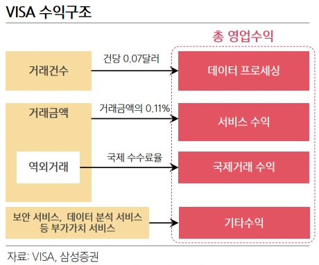 비자의 주 사업은 카드 발급사와 매입사 사이에서 거래 처리 및 서비스를 제공하는 것이다. 거래가 많이 이루어져야 수수료를 더 많이 받을 수 있기 때문에 경기 상황과 실적이 밀접한 관계를 갖는다고 한다.