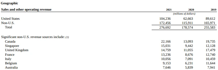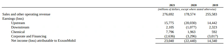 2021년 277B$ 매출을 보였다. 23B$ 규모 전체 이익단에서는 상류부문이 61%, 하류부문이 8%, 화학이 30%를 차지했다.
