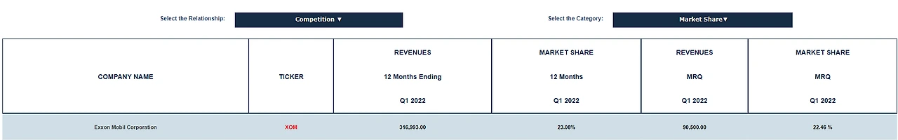 미국에서 매출 기준 20%대 점유율을 보이고 있나 보다. 같은 자료에서 쉐브론이 13%대 점유율을 보이고 있다. 요즘 워런 버핏이 지분율을 늘렸다는 옥시덴탈이 2%대 점유율을 보이고 있다. 같은 자료에서 매출 합계 전체 시장이 대략 1,400B$ 정도 되는 걸로 보인다.