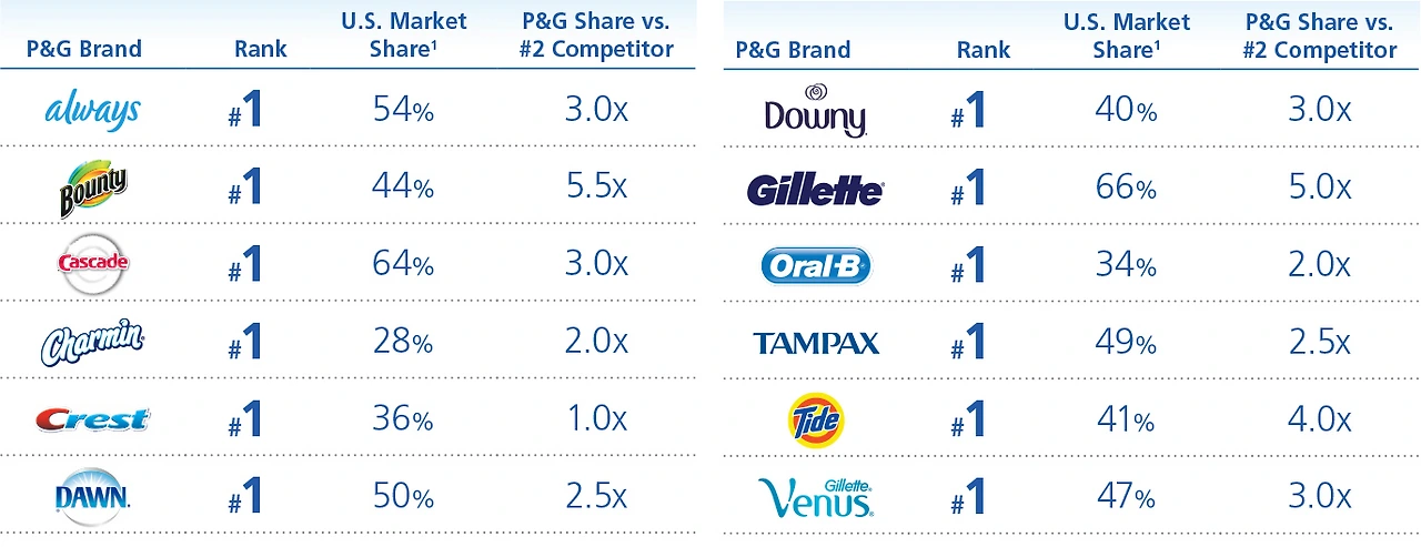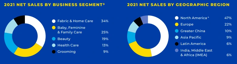 P&G는 세계 최대 생활용품업체이다. 1837년 양초 제조업자 프록터와 비누 제조업자 갬블이 창립하였고 1890년 뉴욕 거래소에 상장되었다. 180개국(참고로 전세계에 200개 나라 정도가 있다고 한다)에서 제품을 판매 중이고 60여개 브랜드가 있다고 한다. 비누, 치약, 칫솔, 샴푸, 면도기 등 필수소비재를 제조, 판매한다. 대표적인 경기방어주로 불리운다.
