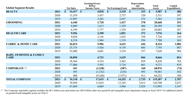 2022년 3월까지 분기 기준 전체적으로는 전년 동기 대비 매출이 7% 늘었고 영업이익은 6% 늘었다. 매출 관련 수량이 3%, 가격이 5% 늘었다. 수량 면에서는 헬스케어가 8%로 가장 많이 늘었고, 가격 면에서는 그루밍이 6%로 가장 많이 올랐다.
