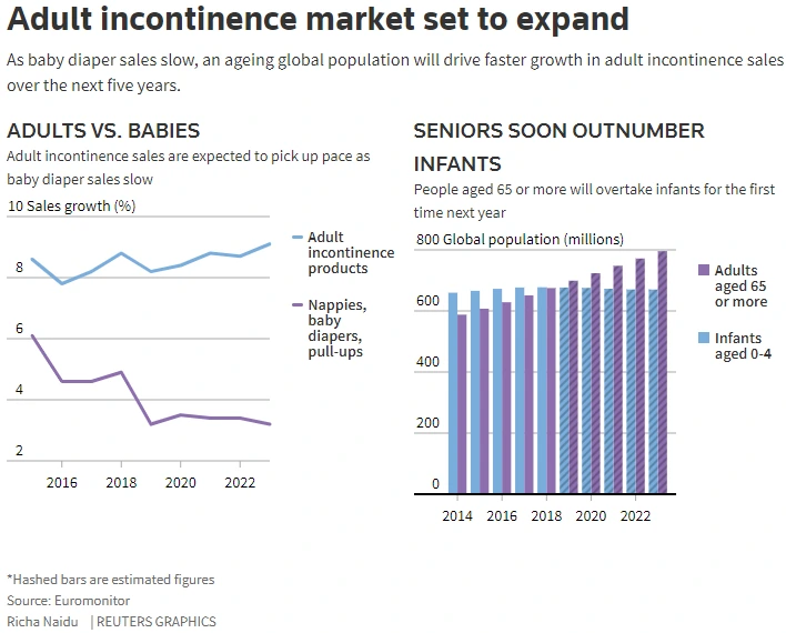 사실 성인용 기저귀 시장이 아기용 기저귀를 넘어설 것이라는 전망이 예전부터 블룸버그든 로이터든에서 계속 나오고 있었다. 저출산과 고령화가 함께 진행되는 인구 구조 변화 때문이었다. 참고로 일본 같은 경우는 2009년 이미 성인용 기저귀 시장이 아기용 기저귀 시장을 앞질렀다고 한다.