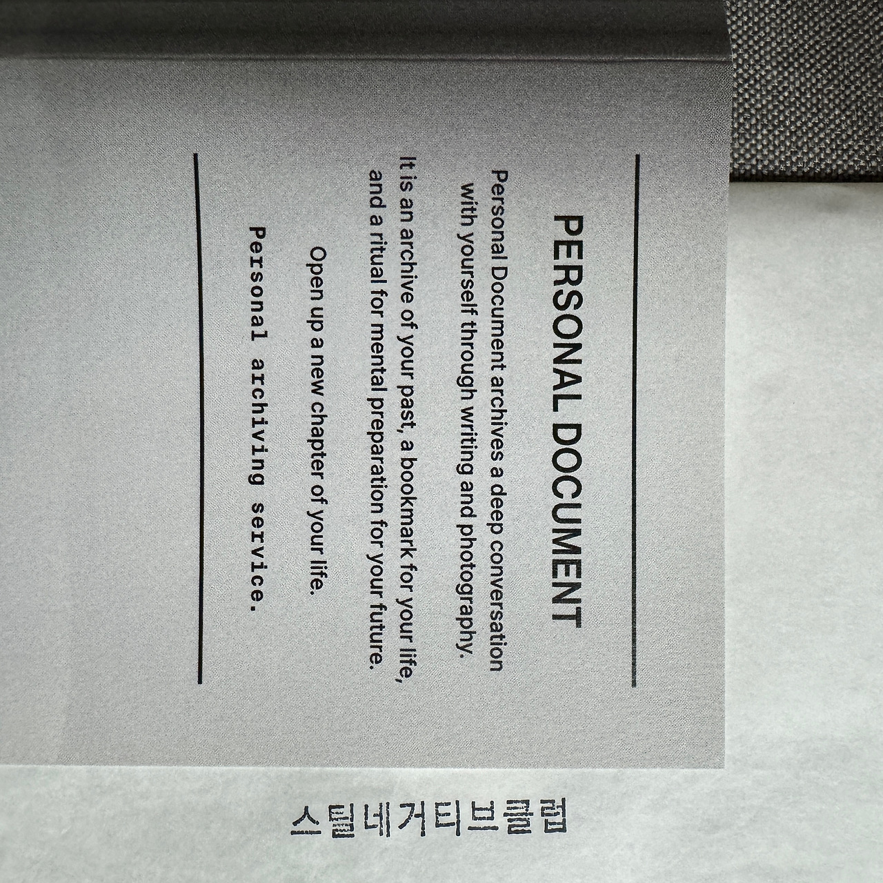 '퍼스널 도큐먼트'는 자신과 온전히 대화하는 시간을 사진과 글로 기록하는 아날로그 방식의 아카이빙 프로그램입니다. 프로그램은 나의 내면을 '문장'으로 기록하는 시간과 나의 외면을 '사진'으로 기록하는 시간으로 구성돼 있습니다.