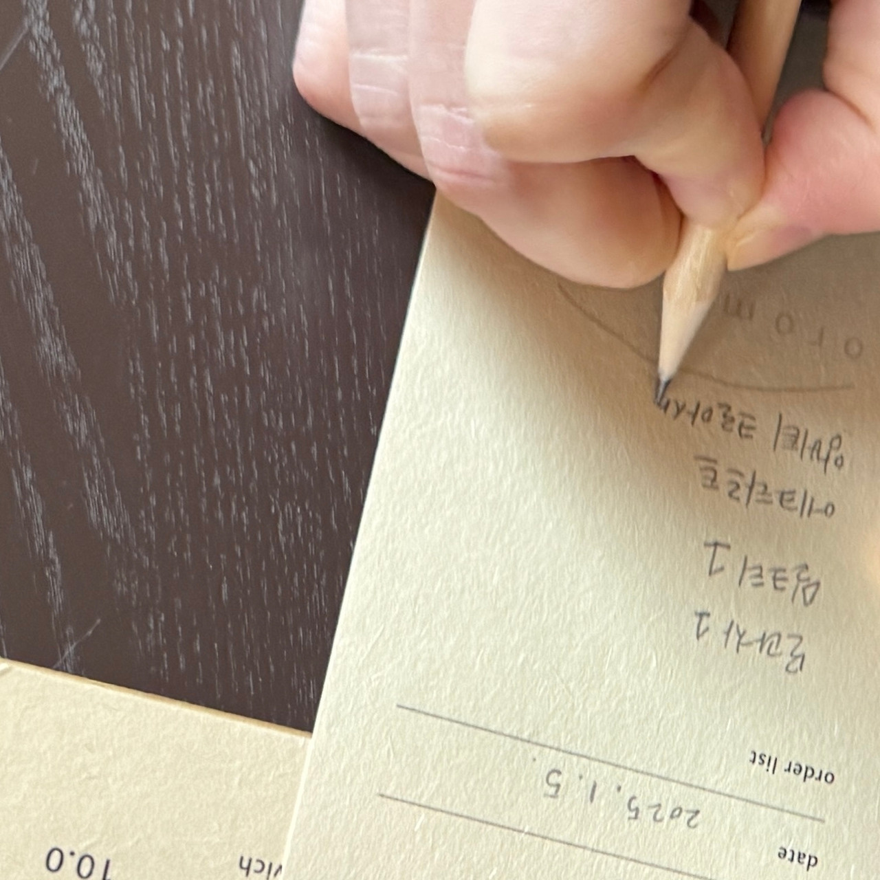 카페 내외벽 색깔과 깔맞춤 된 "주문서"가 기억에 남았다. 우리도 이름과 날짜, 메뉴(모과차, 밀크티, 에그타르트, 앙버터 크루아상)를 직접 손으로 적어 카운터에 전달했다. 이 종이조각들이, 왠지, 바로 버려지지는 않을 것 같고, 주인 분들께서 따로 아카이빙을 해 놓으실 것 같은데, 그렇다면 그 용도가 몹시 궁금해진다. 언젠가 한 번 뵐 기회가 있다면 여쭤보아야겠다.