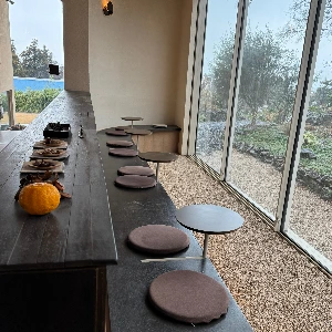 다음번에는 바닥에 작은 돌이 깔린, 나란히 앉아 거뭇한 낮은 돌담과 초록을 바라볼 수 있는 큰 창 앞자리에 앉아 차분히 시간을 보내고 싶다.