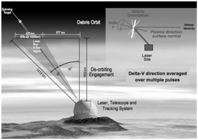 레이저를 이용한 우주쓰레기 처리 방식은 레이저 빔을 사용하여 우주쓰레기를 직접적으로 에너지를 가해 처리하는 방법이다. 이 방식에서는 지구 지상 또는 궤도에 설치된 레이저 시스템을 통해 우주쓰레기를 조준하고, 고출력 레이저를 쏴서 쓰레기의 표면을 가열하고 증발시키는 원리로 작동한다. 레이저 빔이 쓰레기 표면의 물질을 빠르게 가열하면, 물질이 플라즈마 상태로 변하고, 이로 인해 발생하는 반작용으로 우주쓰레기의 속도와 궤도를 변화시킬 수 있다.