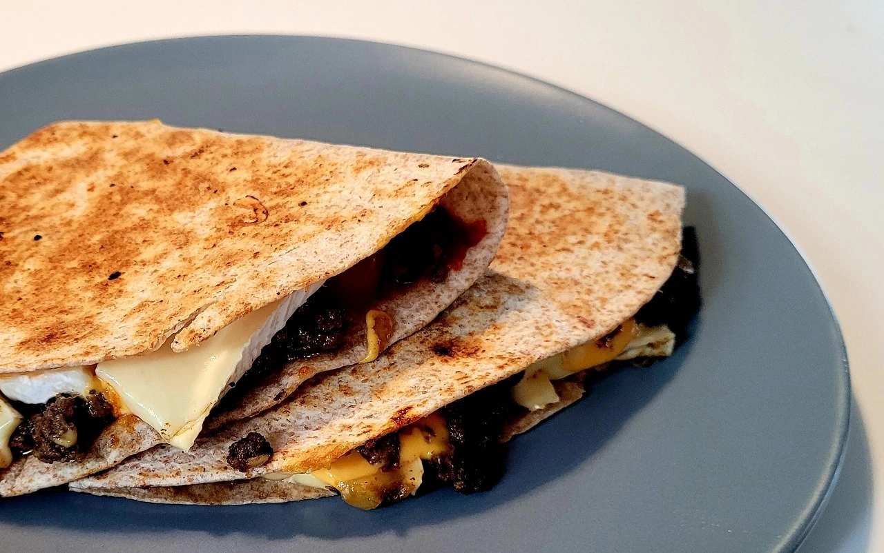 통밀 토르티야 반잘라 한쪽에 고기, 토마토,