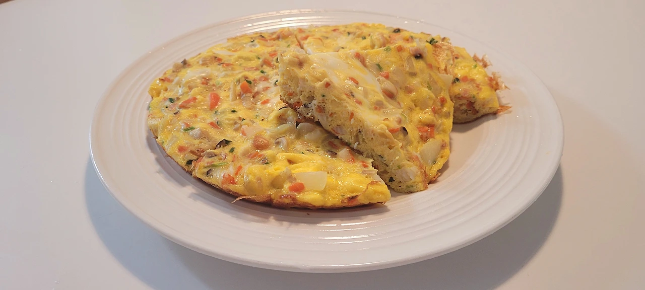 잘게 썰고 계란 6개를 풀어 섞는다.