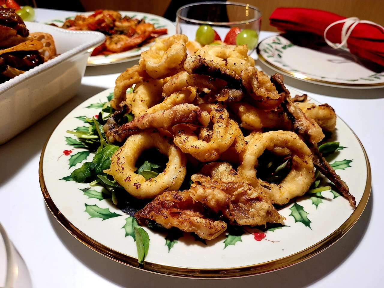 오징어 튀김, 새우 감바스를 만들었답니다.