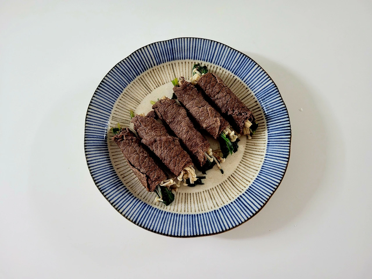 소고기에 팽이버섯과 부추를 듬뿍 넣어 김밥 말듯이 돌돌돌 탄탄하게 감아준다.