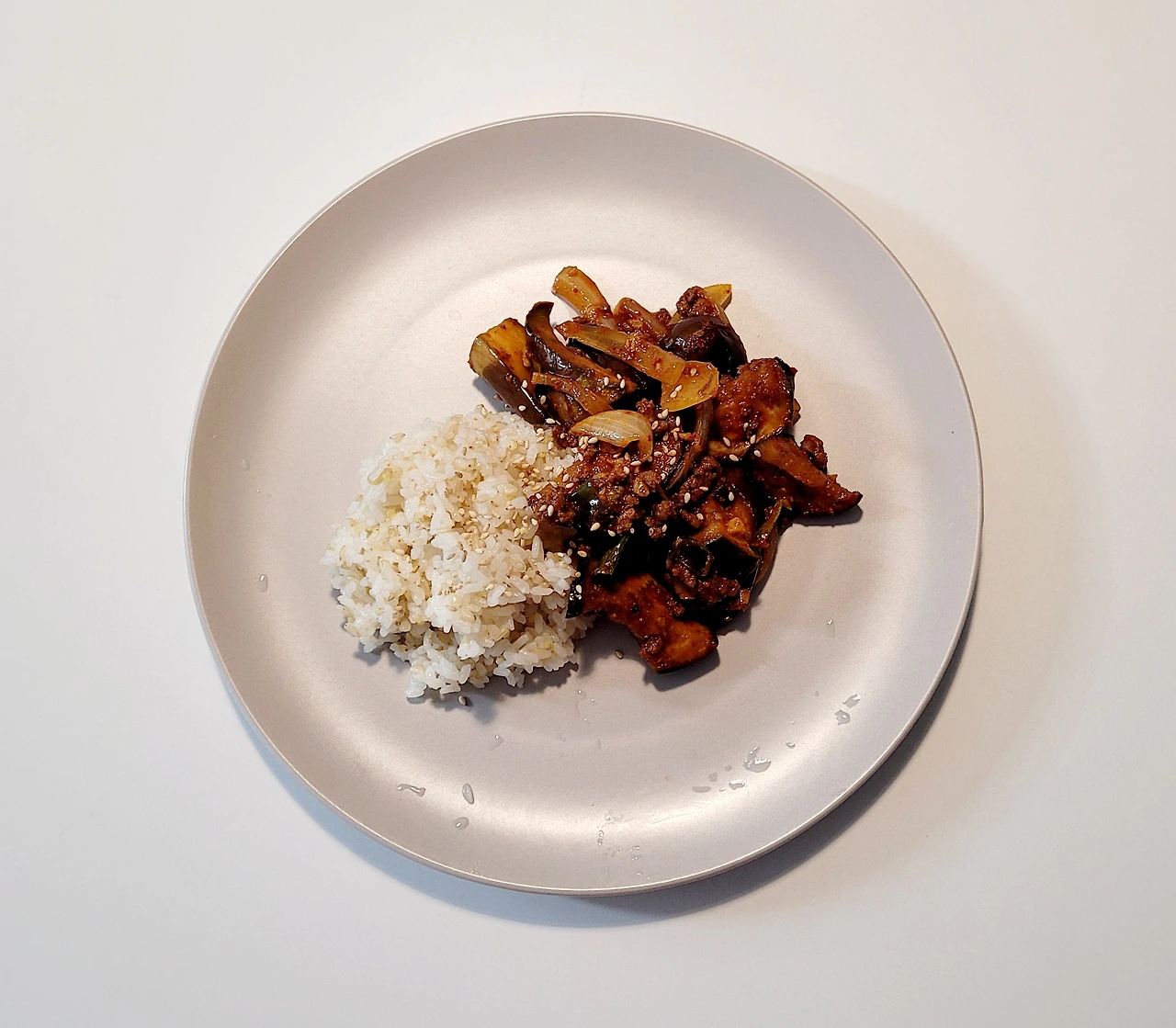 졸인 양념장에 튀겨놓은 가지를 듬뿍 넣고