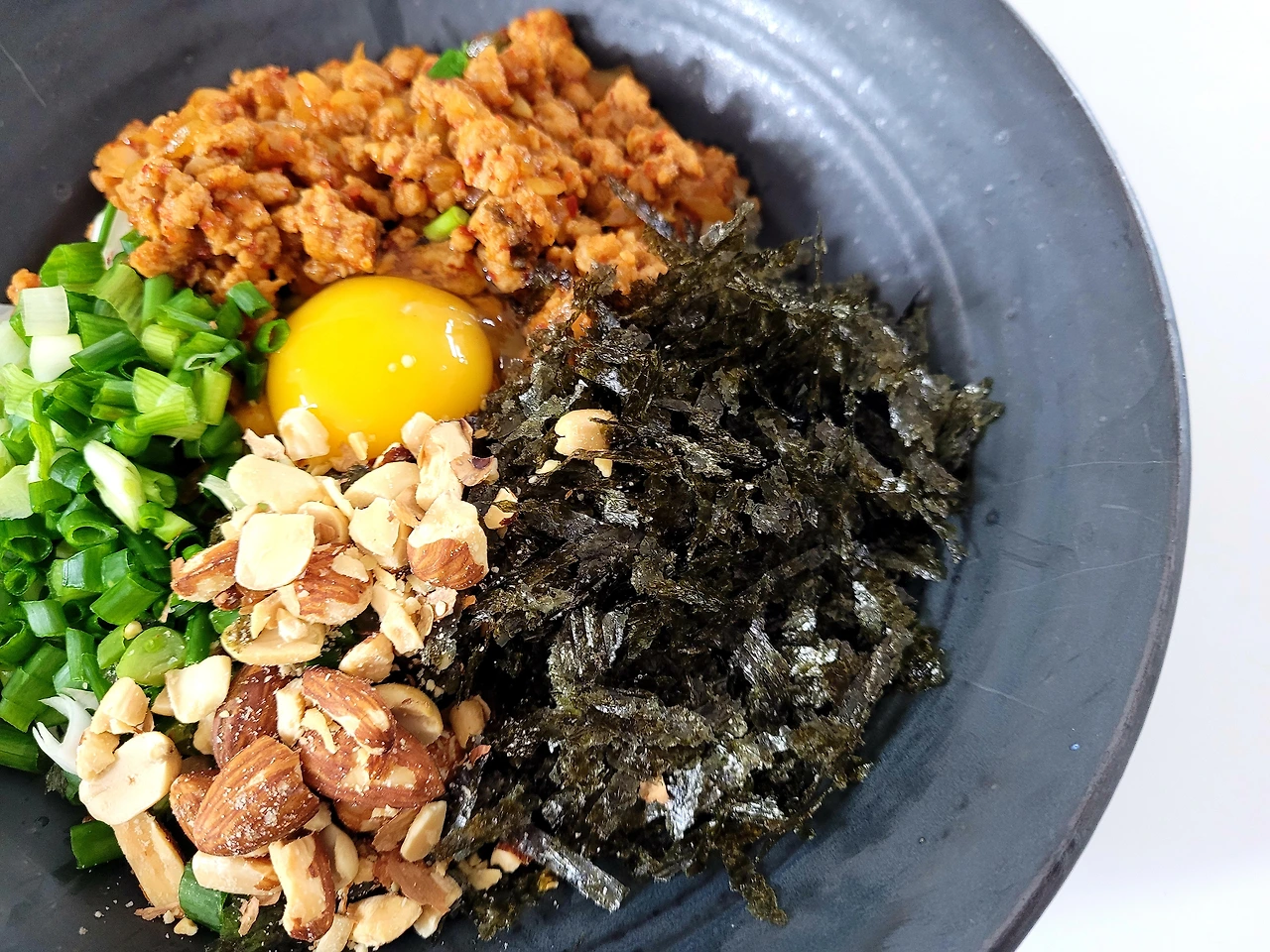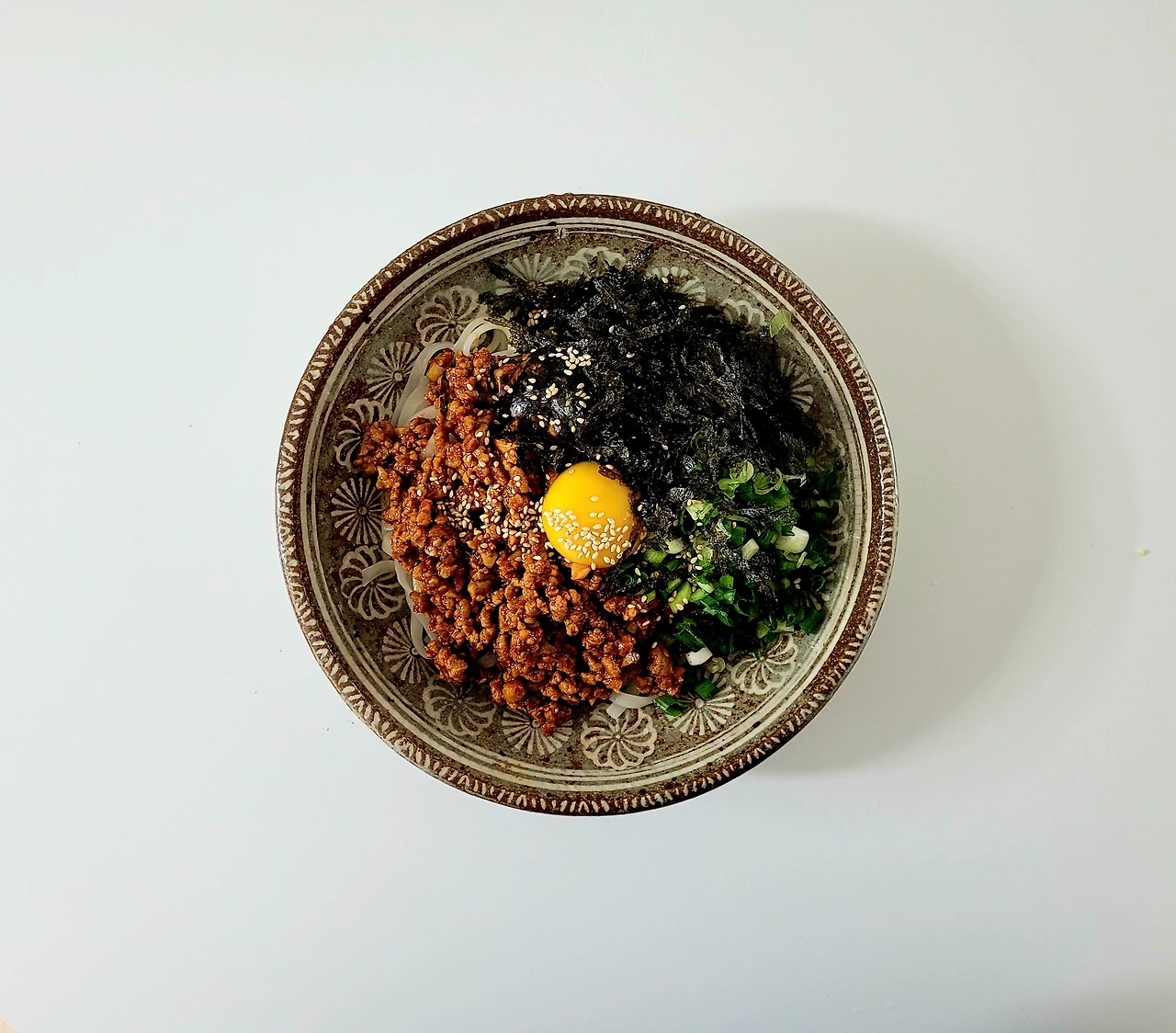 고명으로는 볶은 고기, 쪽파 듬뿍, 김가루를