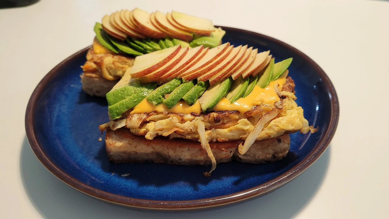 열기를 뺀 바삭한 식빵 한 장을 반 갈라서 노 슈가 케첩 발라주고 양배추, 브리치즈, 아보카도, 사과를 순서대로 잔뜩 얹고