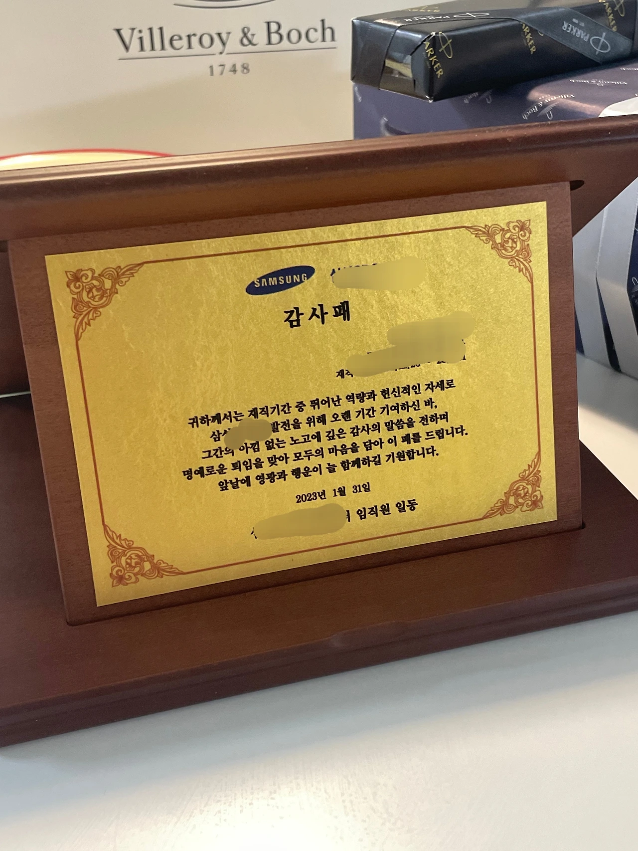 금으로 만든 자랑스런 감사패를 집안에서 제일