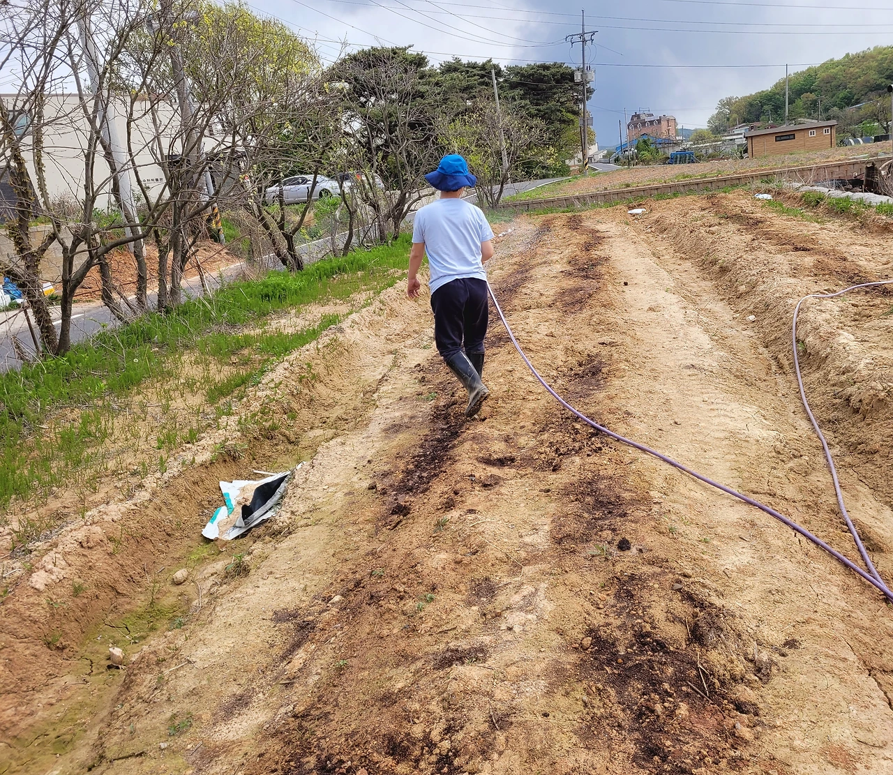 " 우리집 수도에 호스 연결해서 밭에 물 줘요.