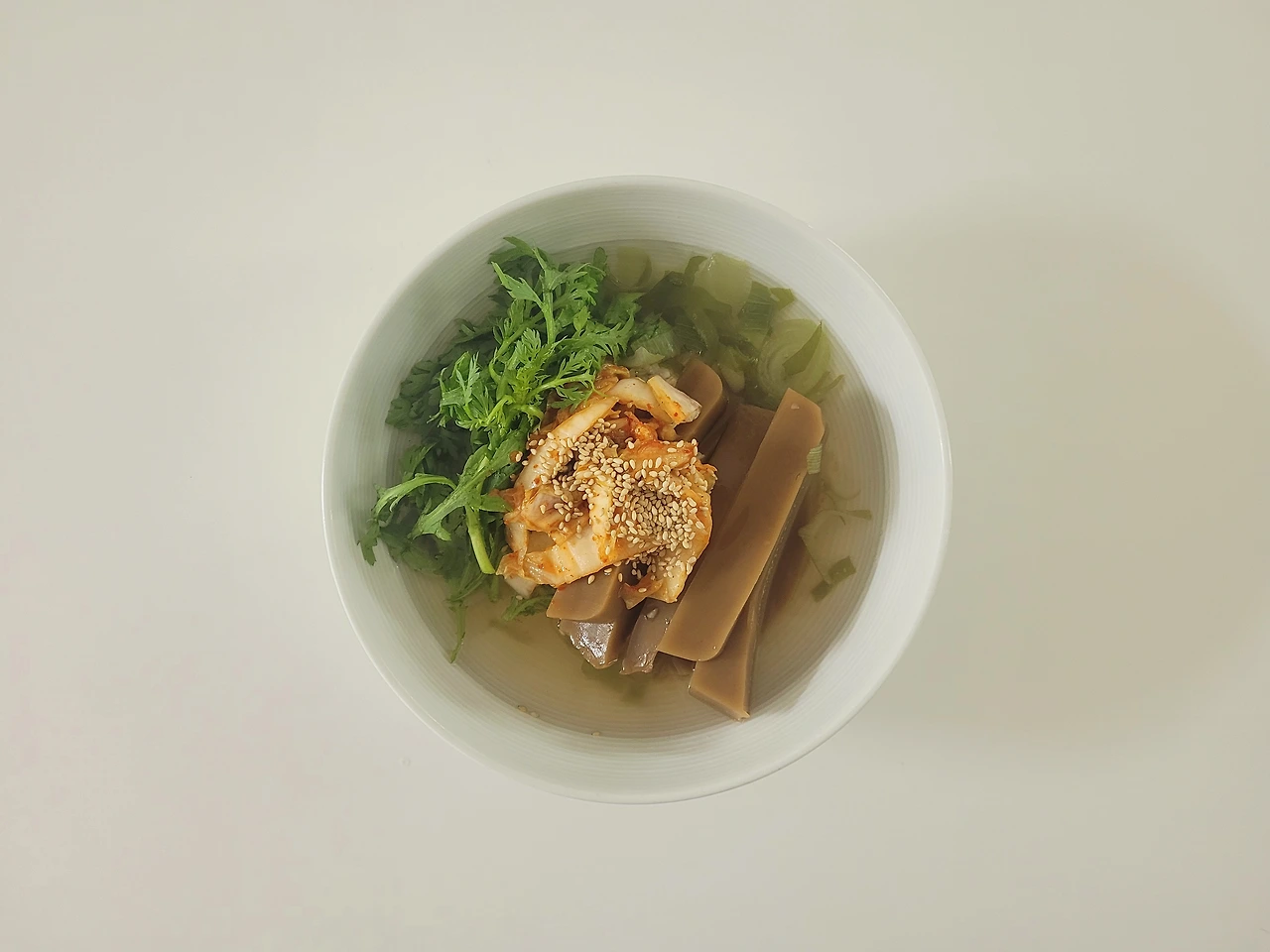국물에 밥, 묵, 김치 올려 먹으면 된다.