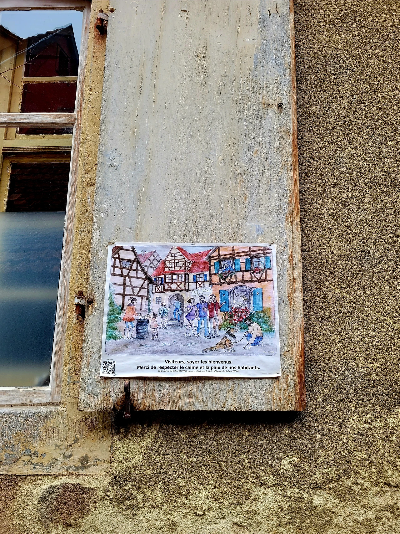 자세히 들여다보니 관광객들이 가득한 에귀샤임의 골목을 묘사했다. 서로 조용히 하자는 말풍선도 보인다.