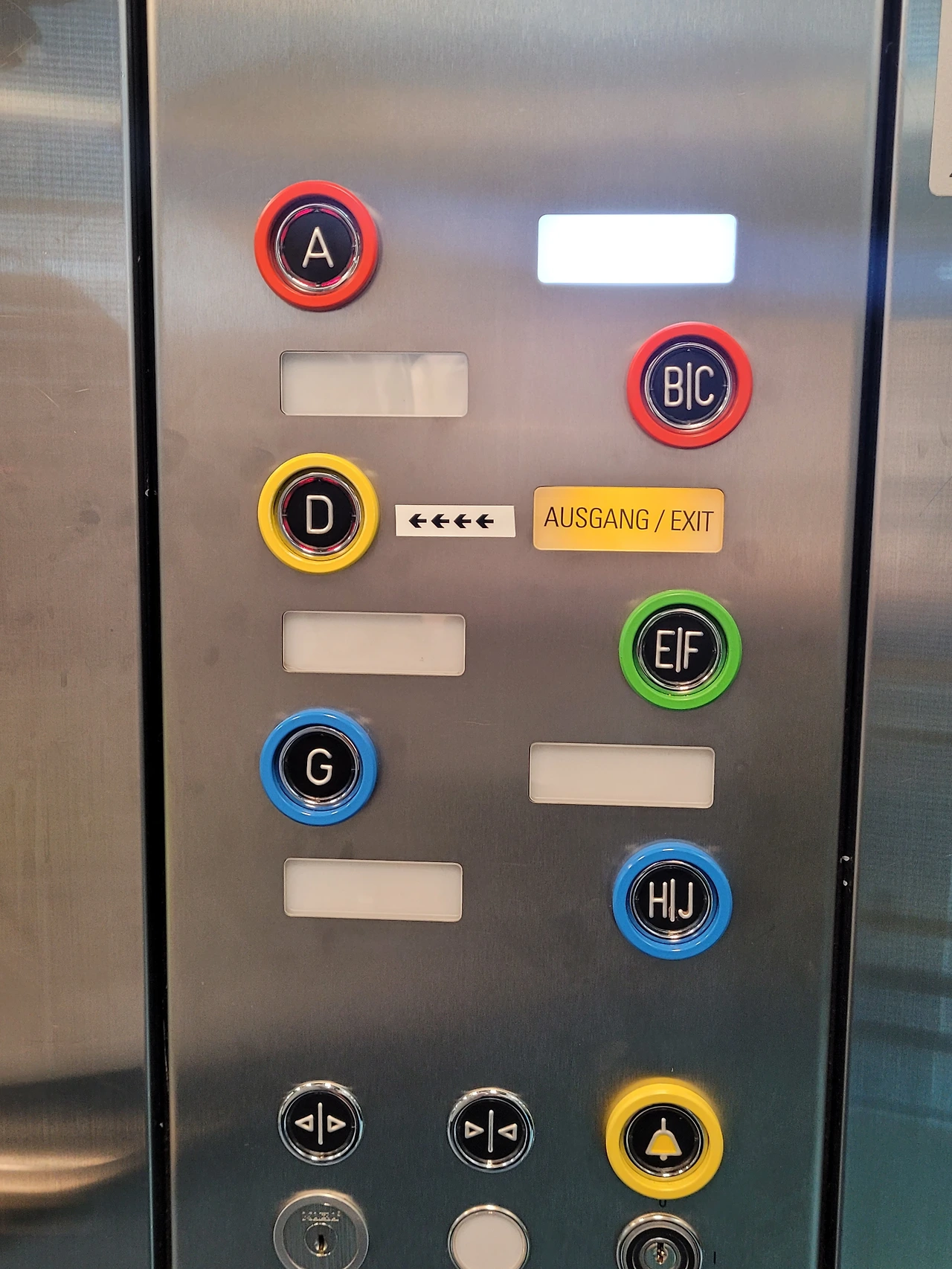 주차장 엘리베이터 버튼이 재미있어서 사진을 찍었다. 디자인의 도시라서인지 버튼색도 알록달록 재미있었는데 난 아직도 저 버튼의 의미를 이해하지 못했다. 기억하는 것은