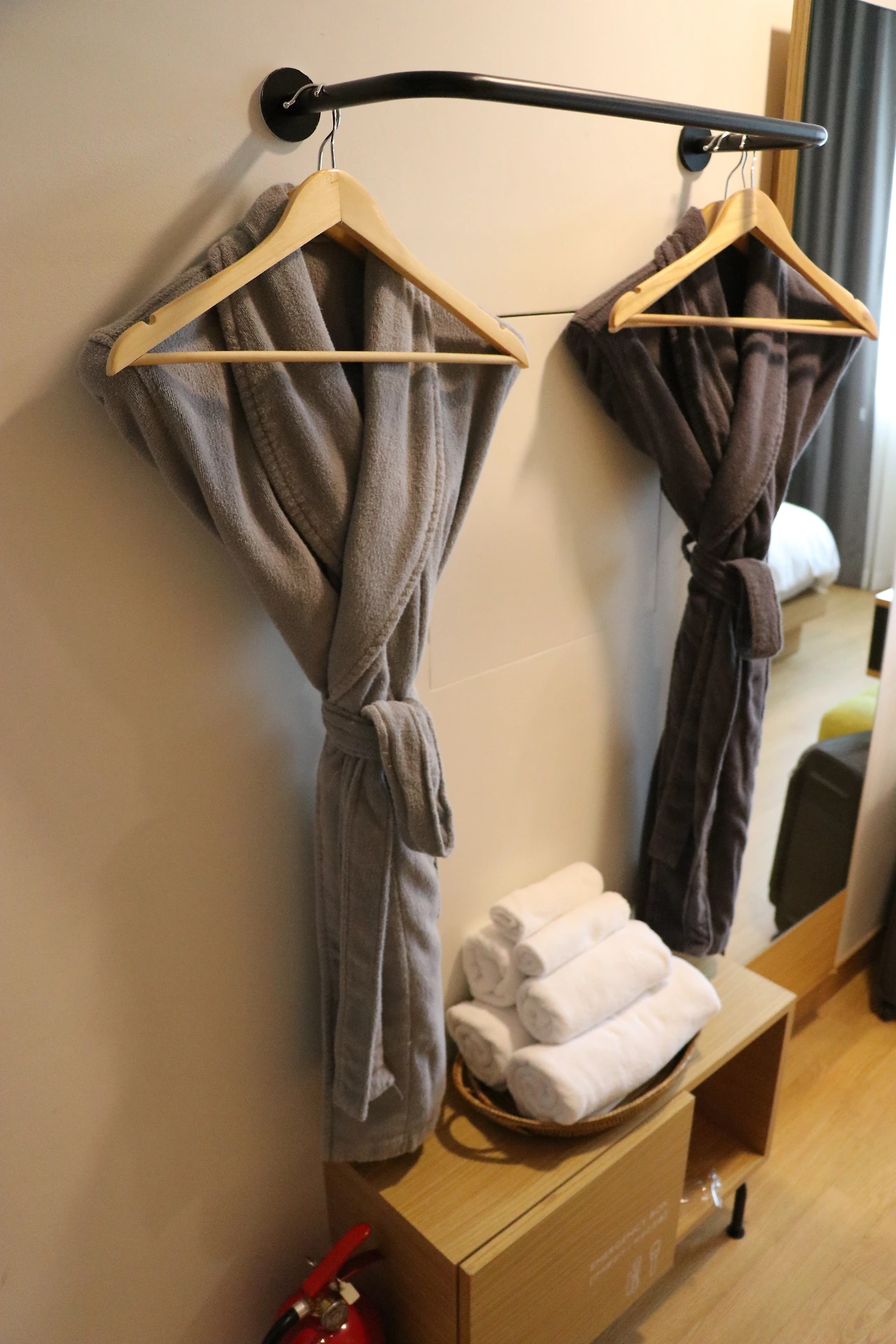 공간의 최적화를 위해 옷장을 없애고 간편한 옷걸이와 선반을 활용했다.