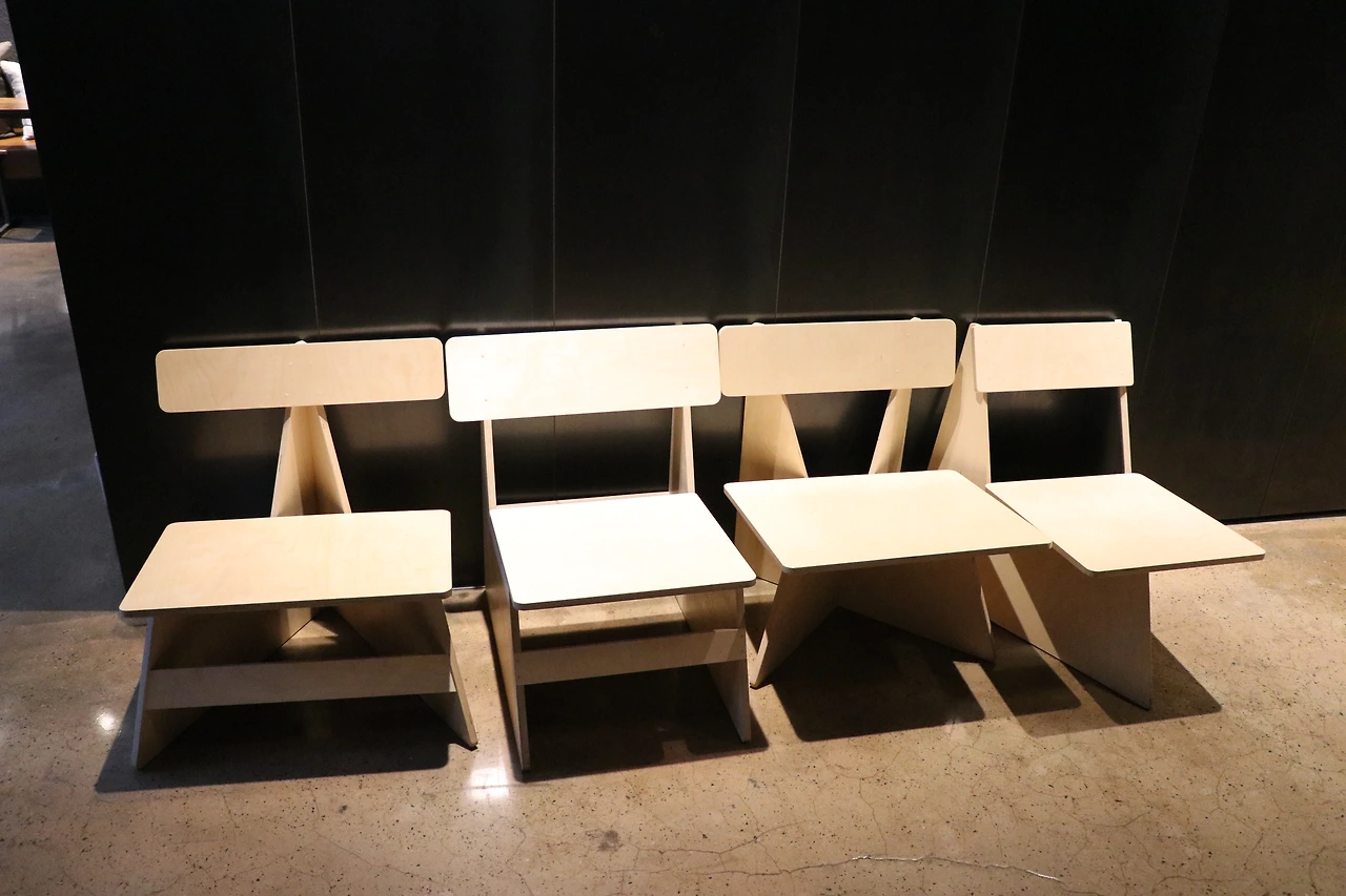 자작나무 합판을 이용해 만든 의자인데, 작가는 해마다 만들어지는 합판의 70%가 조각으로 버려진다는 메시지를 전하고자 작품을 만들게 되었고, 4x8사이즈의 합판이 버려지는 부분 하나 없이 만들어 진것이 저 의자이며, 온전히 버려지지 않고 쓰임을 보여주는 설계도로 프론트 벽면을 채운것이다.