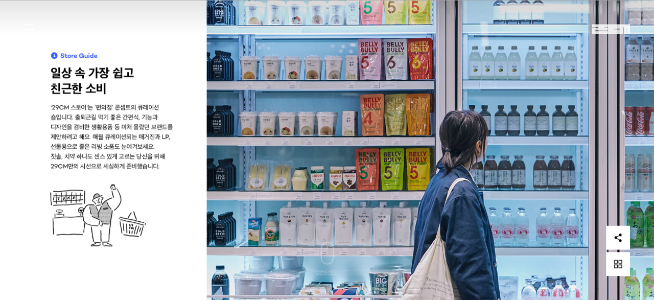 이를 실천하기 위해 가장 고객에게 가깝게 다가가야 하는 방법을 고민하다가 편의점 컨셉으로 출발했다. 29CM만의 큐레이션 능력으로 이 곳에 오는 사람들이 정말 자주 쓸법한, 그리고 좋은 브랜드와 제품을 선별해서 입점시켰다.