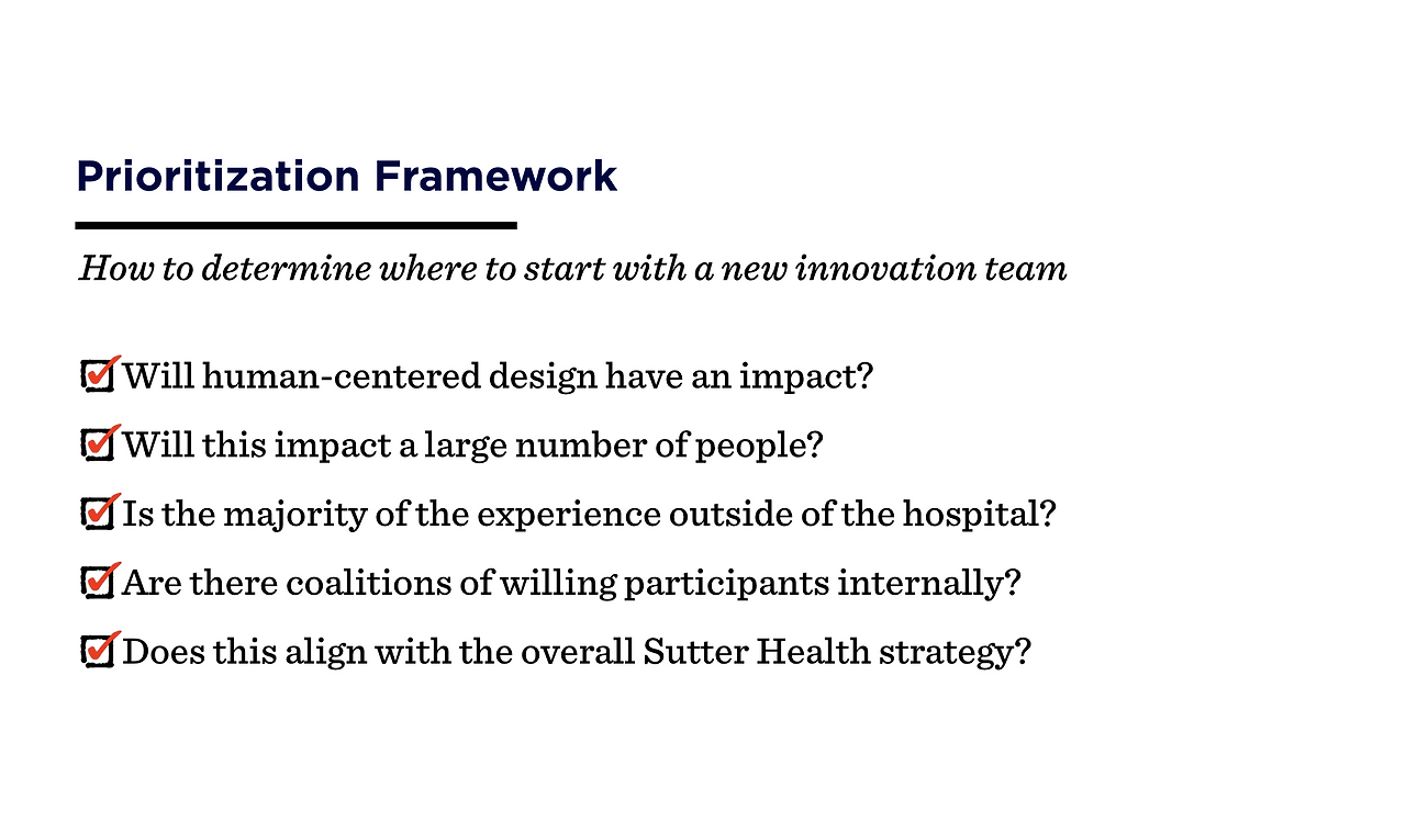 Chris Waugh는 질병대책센터에 일하고 있었다. IDEO에서는 One medical에 디자인 부회장으로 있었고. 지금은 S 55000명의 직원, 350만명의 환자를 두고 있는 utter Health 에서 혁신을 이끌고 있다. 이 Sutter Health는 소아과부터 이식전문센터에 이르기까지 다양한 진료과목을 두고 있는 곳이다.(비영리 의료기관)