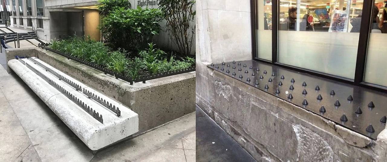 사실 몇몇 적대적인 디자인은 홈리스에 대항하여 만들어지기도 합니다. 공공장소는 노숙자를 위해 주어지는 공간이 아니라는 메시지를 보내죠. 뉴욕시 주변에는 메탈로 뾰족뾰족된 곳들을 빌딩이나 가게 앞에서 볼 수 있습니다. 이 모든 것들은 '당신은 이 곳에 머무를 수 없습니다' 라는 메시지를 정확히 보냅니다.