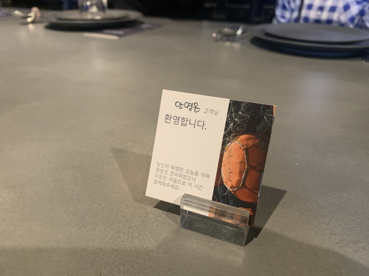 비싼 파인 다이닝을 많이 경험해본 적은 별로 없지만, 친히 예약자 이름을 적어두어, 존중받는 첫 인상을 주기에 충분하다. 사전에 전복 물회/ 뿔소라 미역국을 선택할 수 있도록 문자를 주고 받는 경험도 다이닝의 주인공이 되어 맛있는 음식을 누릴 수 있다는 기대감을 심어주었다.