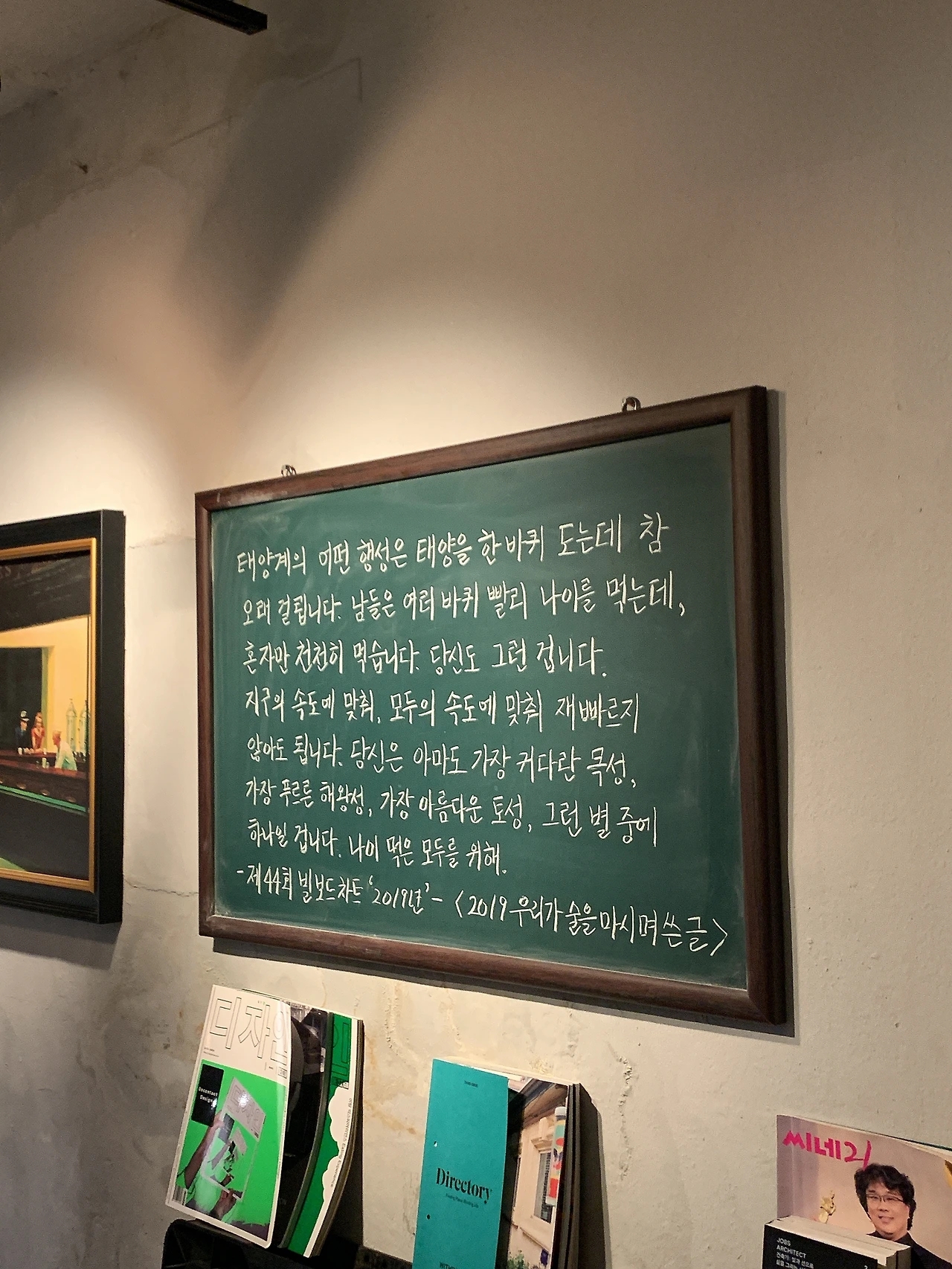 벽 한쪽에 매 달 새로운 주제에 따라 손님들은 자유롭게 짧은 글을 쓸 수 있고, 손님들의 투표를 반영해 주인장이 선정한 글과 당선작들이 인스타그램에 올라온다.