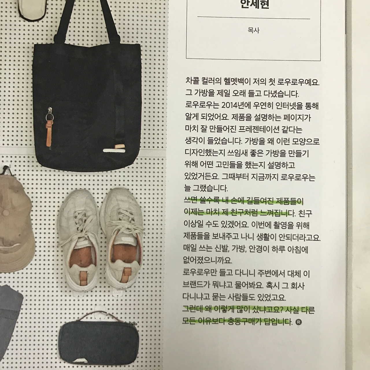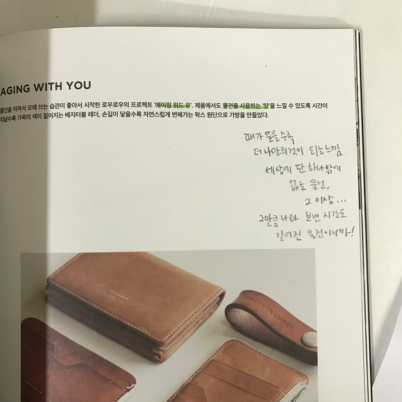 하지만 그냥 "쓸수록 색이 변합니다. 빈티지한 맛이 살아납니다" 이것보다 "당신과 함께 나이가 든다는 것만으로도 큰 행복이에요, 그저 묵묵히 옆에 오래오래 있을거예요." 로 말했을 때 더 내것같고 애착이 가는거다.이게 로우로우의 섬세하고 아주 작지만 애틋해지는, 아낄 수 밖에 없는 이유인것 같다.